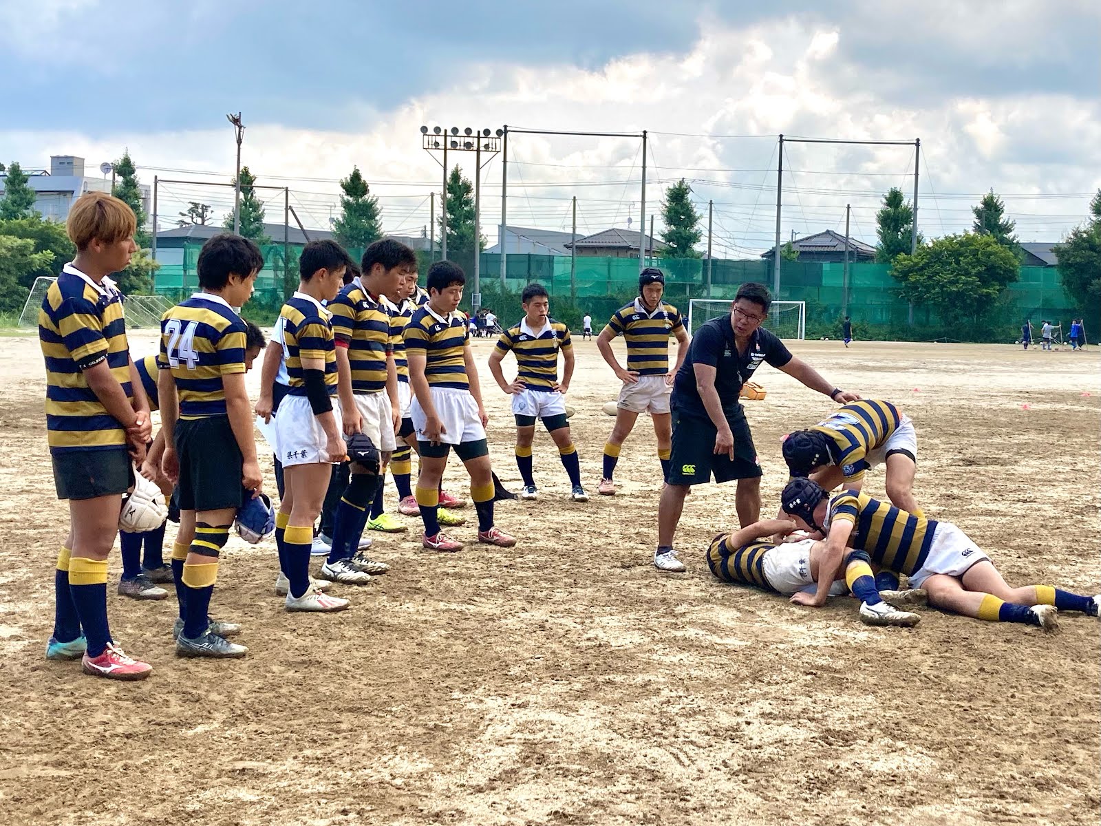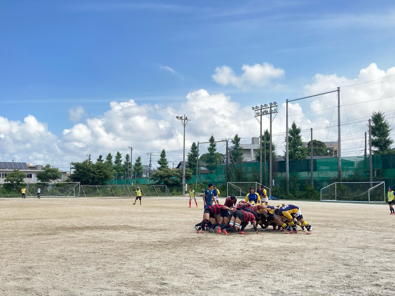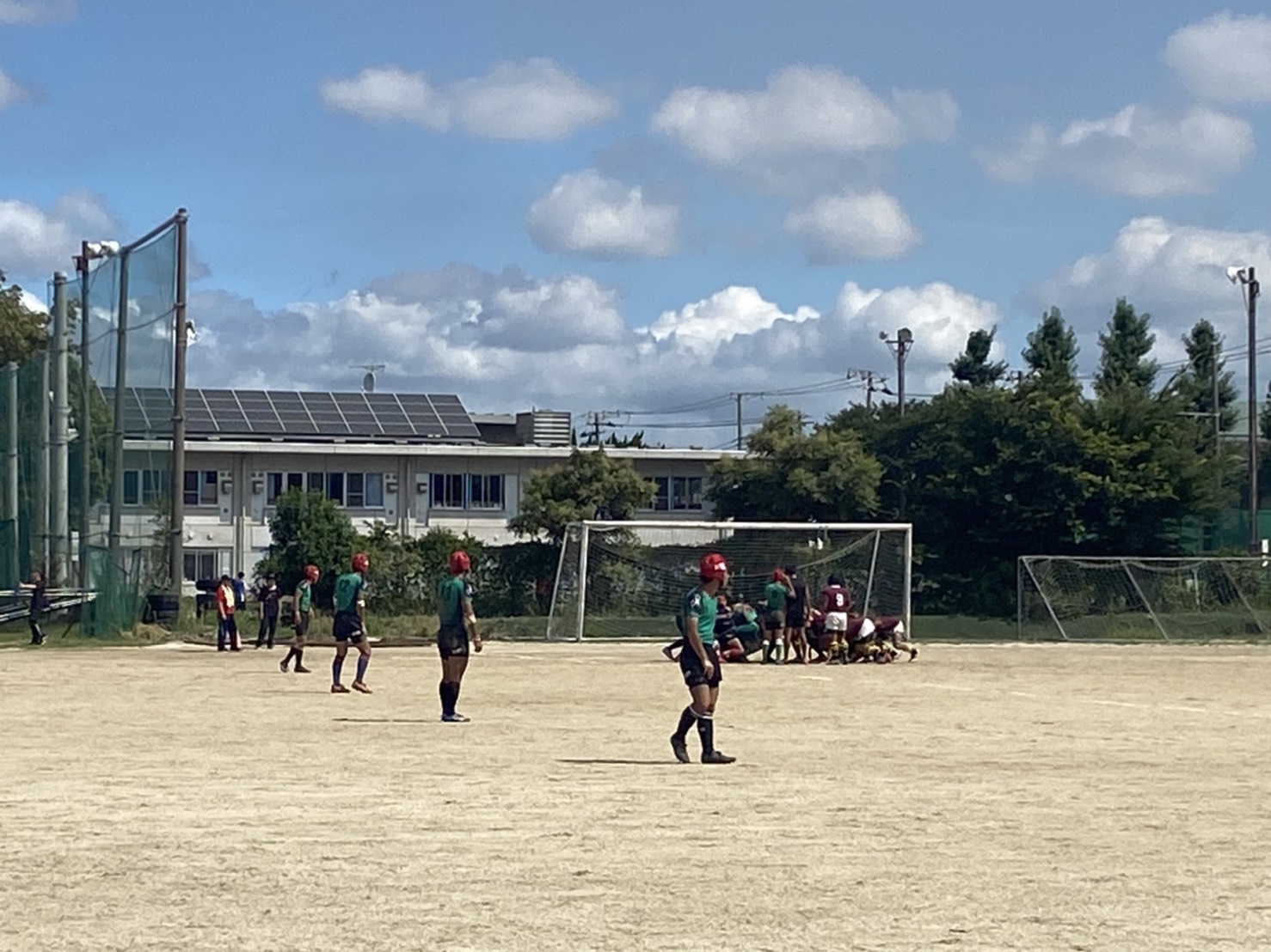 20分ゲームを2本、10分ゲームを1本行いました。ディフェンスを中心に、練習してきたことを実践できるよう取り組んでいましたが、似たようなパターンでトライやゲインされたりなど、まだまだ成長の余地があるように感じられました。両校ともに対し、十分戦える力はありましたが試合の雰囲気作りに波があるのが現在の課題です。技術・戦術ももちろん大切ですが、暑い中前向きに試合に取り組めるよう声を出したり、コミュニケーションを取ったり、チームとして団結していって欲しいと思います( ¨̮ )